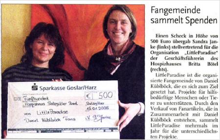 Sandra Janke besuchte das Hospizhaus in Salzgitter und übergab aus dem Erlös der LP Weihnachtskartenaktion 2007 einen symbolischen Scheck in Höhe von 500€.