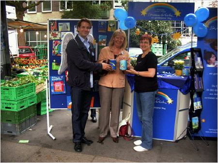 Die Übergabe war am St. Martinstag, d.h. also am 29. September und der Übergabeort war nicht grade ideal für so eine Aktion. Immerhin ist der Isemarkt einer der größten Wochenmärkte in Hamburg und entsprechend voll war es natürlich – nur die erhoffte Presse hatte schon vorzeitig ihre Zelte wieder abgebaut … na gut, dann haben wir selber ein paar Bilder gemacht – auch das eine schwierige Aktion wenn ständig jemand ins Bild läuft …