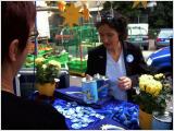 Kaum habe ich Platz genommen und mal kurz die Spendendose geschwenkt sind auch schon die ersten Interessenten da und bewundern unseren Spezialbutton. Es wird gerne gespendet und so gehen die Buttons schnell weg ... besonders gut war dabei das Zusammenspiel zwischen Crazy und mir. Wenn immer sie einen Konzertbutton als "fliegender Händler" gegen Spende abgibt weist sie auf meinen Standort hin und so kann bzw. muss ich schon nach nur 1 Std. "alle Buttons sind weg" melden.